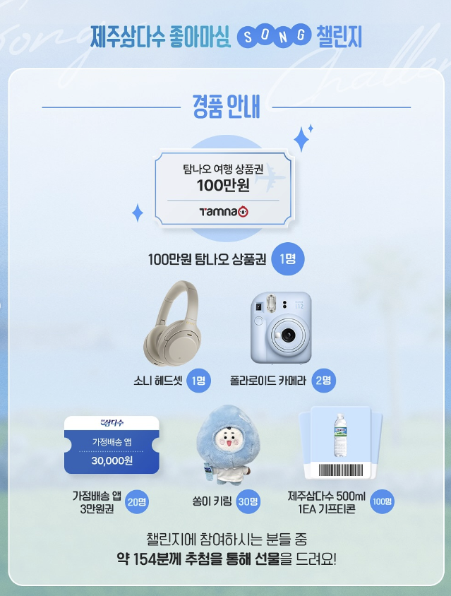 우수 콘텐츠로 선정된 참여자에게는 탐나오 제주 여행 100만원 상품권, 소니 헤드셋, 제주삼다수 가정배송앱 금액권 등 풍성한 경품이 제공된다. 당첨자는 6월 16일 개별 안내되며, 자세한 내용은 제주삼다수 공식 인스타그램 계정에서 확인할 수 있다.