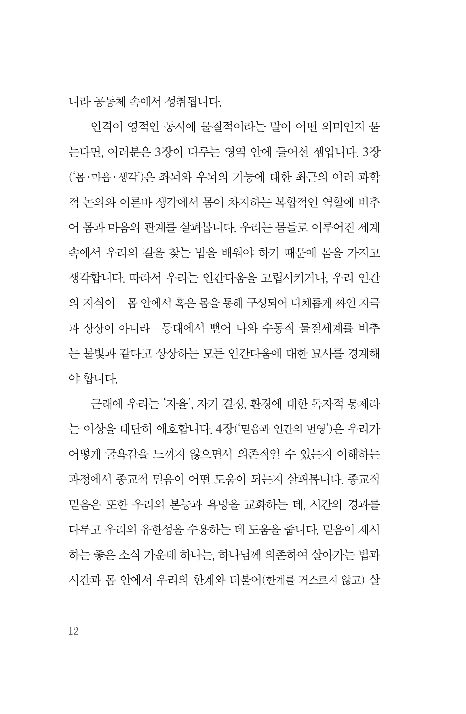 우리 사회에서 어떤 종류의 인간성을 계발하고 싶은지 일관된 모델이 없다면, 우리가 어떻게 가르치고, 누구에게 투표하고, 어떻게 저축하고, 어떻게 사고팔고, 어떻게 여가 생활을 즐기고, 생의 시작과 끝에 대해 어떻게 생각할지 계속 표류할 수밖에 없을 것입니다. 이 작은 책이 우리가 논의하는 주제와 관련된 다양한 질문에 대해 완전한 답을 제시할 수는 없겠지만, 이런 질문을 다룰 때 그리스도인이 염두에 두기 바라는 우선순위가 무엇인지 명확히 하는 데 도움이 되기를 바랍니다. 또한 이 책이 하나님이 바라시는 존재에 이르지 못하도록 우리를 압박하는 정치적·경제적·심리적 세력에 저항하는 하나의 매뉴얼이 되기를 간절히 소망합니다.