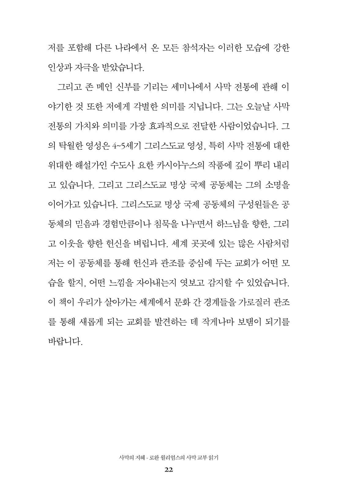 “4~5세기에 활동한 위대한 수도사들이 남긴 글 중 어느 글을 읽더라도 분명하게 발견되는 특징이 하나 있습니다. 그것은 바로 그리스도의 몸 안에서 살아가는 삶이란 구체적인 공동체를 이루며 살아가는 삶, 이 세계에서 실제로 일어나는 활동이기에 관조나 묵상 혹은 ‘영적인 삶’에 대해 추상적으로 생각하는 것은 불가능하다는 것입니다. ... 하느님과 친밀함을 이루는 삶이란 함께 더불어 사는 삶으로 새롭게 거듭나는 과정이자 그 결실이라고 그들은 한목소리로 말합니다. ... 사막 수도사들의 유산을 숙고해 보는 이 시간, 저는 그들이 함께 더불어 사는 삶에 대해 어떻게 생각했는지 ... 살펴보려 합니다. 이를 통해 우리는 주님을 찾고, 좇으며, 닮아가는 그리스도인들의 모임으로서 공동체를 기도의 삶, 함께 더불어 사는 삶 속에서 새롭게 거듭나게 할 원천을 발견하고 ... 무언가를 배울 수 있을 것입니다.” (본문 中)