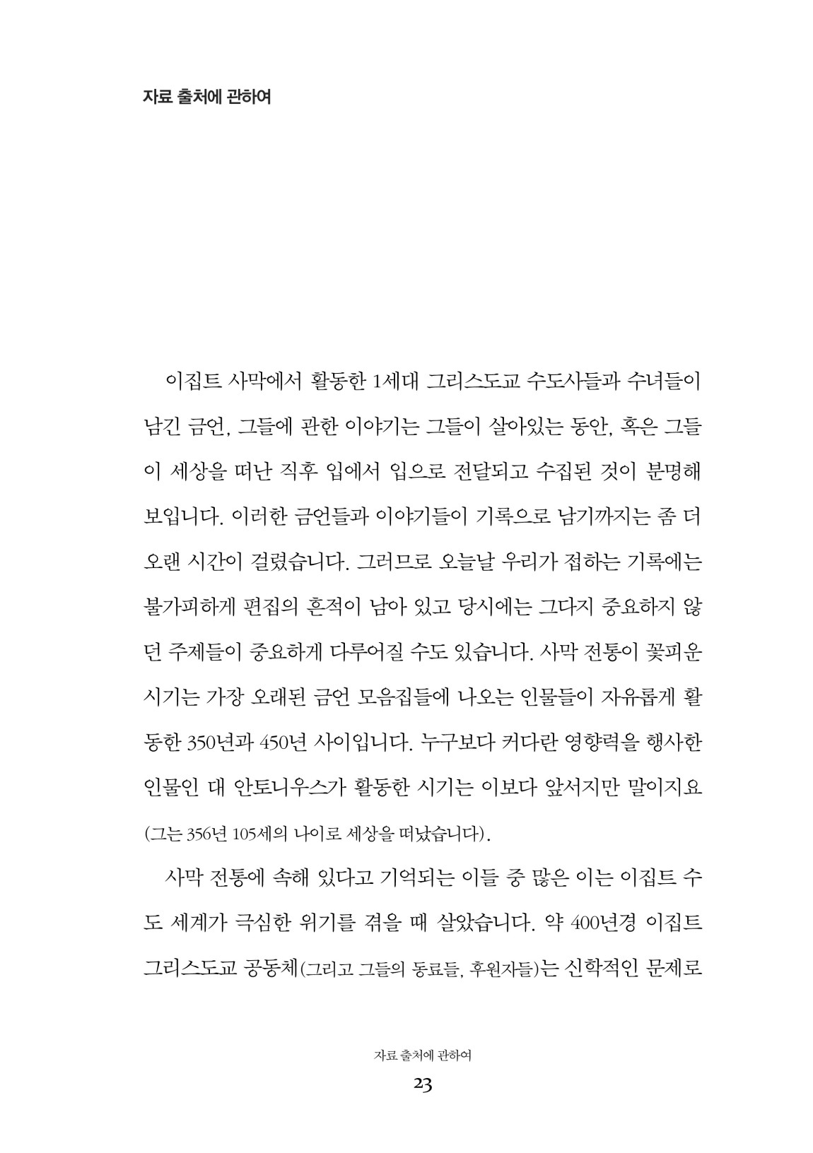 언뜻 보기에 수도원 운동은 어떤 타협도 없이 다른 사람들의 개입, 그리고 이들과 엮임으로써 수반되는 삶 전체를 차단하고 거부하는 운동처럼 보입니다. 나중에 좀 더 살펴보겠습니다만, 사막 수도 전통의 글들을 유심히 살피다 보면 공통으로 발견되는 표현이 있습니다. 바로 다른 이들에게서 “도피한다”는 표현입니다. 수도원 운동은 그리스도교인의 숫자가 급격히 늘어나는데 교회는 점점 더 부패하고 세속화되는 당대 상황에 대한 우려와 밀접한 연관이 있습니다. 사막에서 공동체를 일군 초기 수도사들과 수녀들은 당시 교회가 진실로 무엇에 관한 곳인지, 무엇이 되어야 할 곳인지가 ‘일상’에서 충분히 드러나지 못하고 있다고 확신했습니다. 그들은 교회가 진실로 어떠한 곳인지, 또한 어떠한 곳이 되어야 하는지 알고자 했습니다. 달리 말하면 어떠한 인간성을 지녀야, 어떠한 인간이 되어야 예수 그리스도를 통해 하느님과 교감을 나누게 되는지를 알고자 했던 것입니다.---p.31