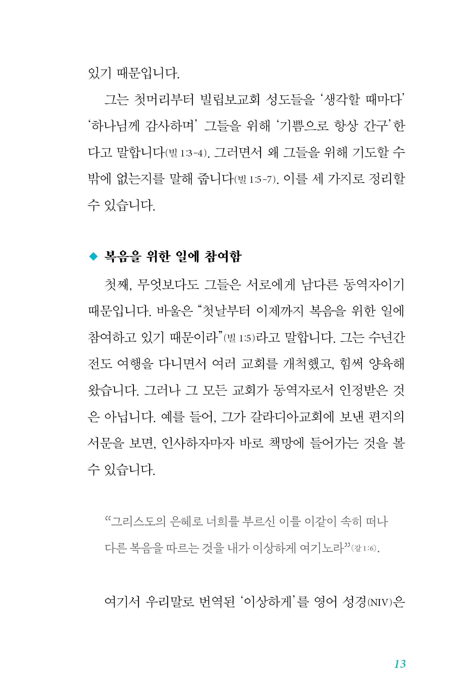 이 책에서는 그 깨달음에 기초한 11가지 믿음의 질문을 통해, 열심은 있으나 가슴은 메마르고, 열매의 수확은 있으나 감사의 씨앗은 없는 무기력한 신앙이 아닌 성령 충만함으로 가슴 뛰는 살아 있는 믿음을 가지라고 이야기한다. 이 책을 통해 감옥에서도 기쁨을 잃지 않았던 바울의 믿음과 빌립보교회를 향한 소망이 새롭게 자라나길 기대한다.
