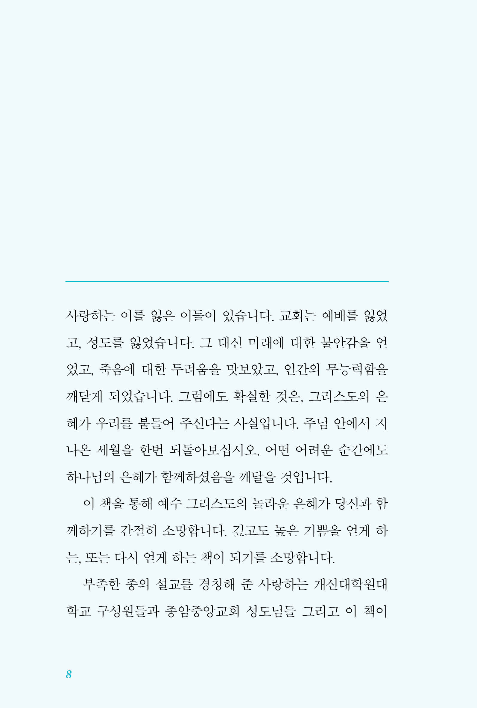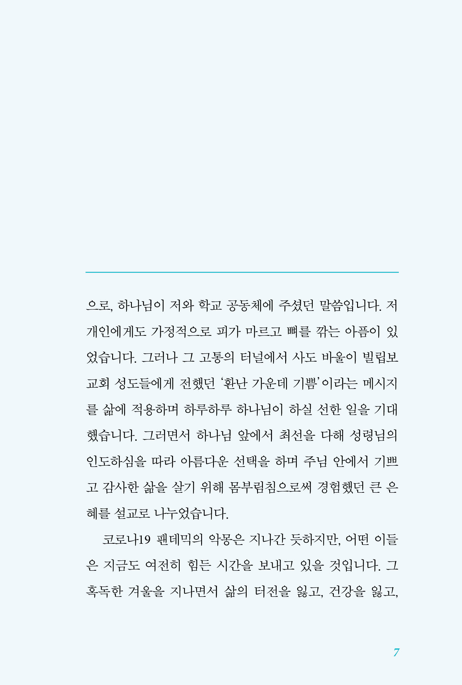 팬데믹이라는 초유의 상황을 겪으며, 그는 다시 빌립보서를 펼치게 되었고, 채플시간을 통해 학생들과 함께 이 말씀을 나누었다고 한다. 그리고 상황이나 환경에 휘둘리지 않는 참 믿음에 대해 깊이 묵상하며 바울이 빌립보교회에 전한 ‘믿음의 감사’와 ‘사랑의 권면’과 ‘자족의 은혜’가 무엇인지 깨닫게 되었다.