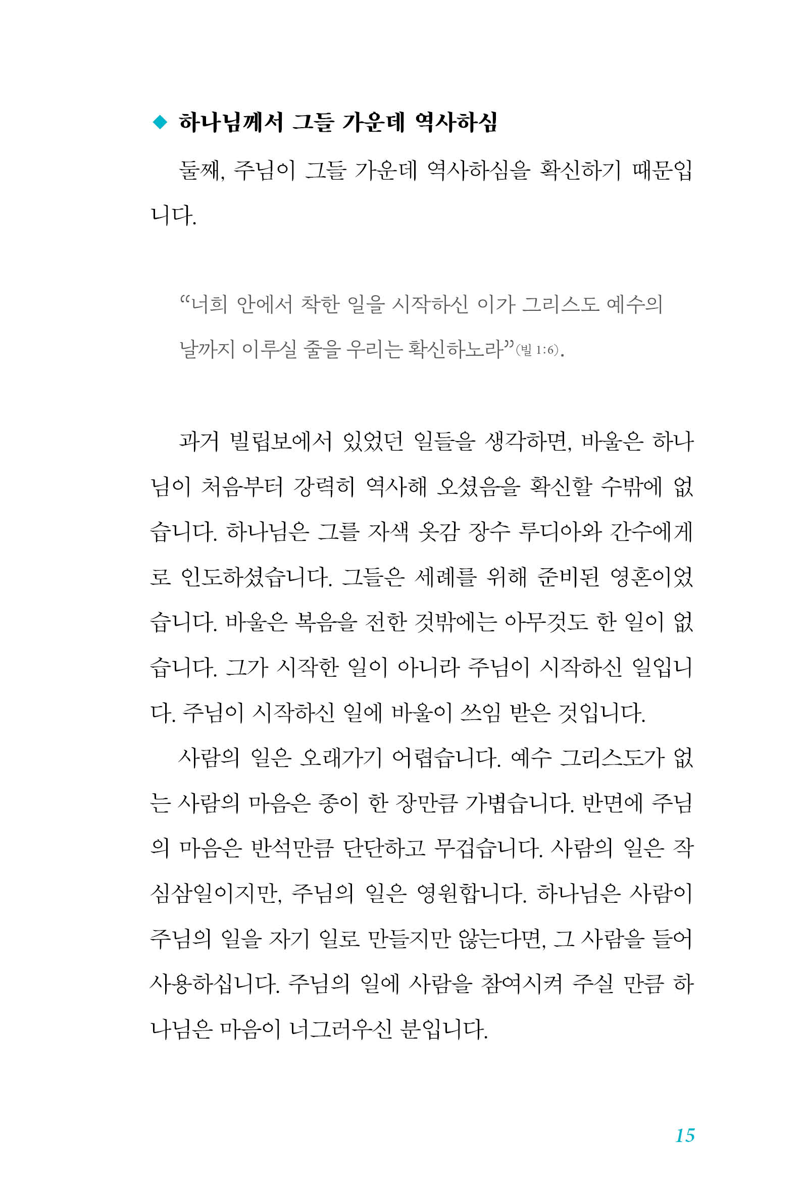 이 책에서는 그 깨달음에 기초한 11가지 믿음의 질문을 통해, 열심은 있으나 가슴은 메마르고, 열매의 수확은 있으나 감사의 씨앗은 없는 무기력한 신앙이 아닌 성령 충만함으로 가슴 뛰는 살아 있는 믿음을 가지라고 이야기한다. 이 책을 통해 감옥에서도 기쁨을 잃지 않았던 바울의 믿음과 빌립보교회를 향한 소망이 새롭게 자라나길 기대한다.
