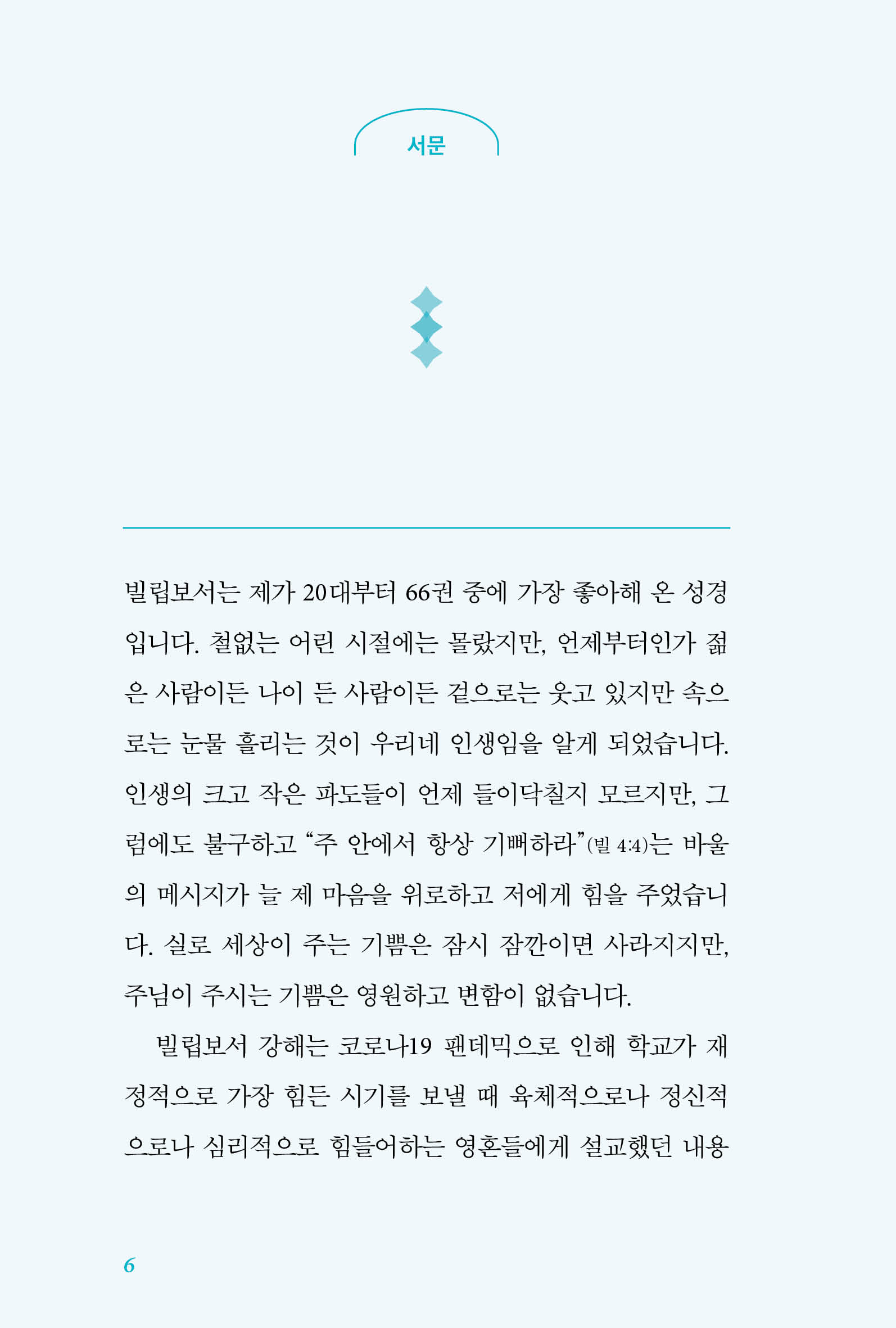 팬데믹이라는 초유의 상황을 겪으며, 그는 다시 빌립보서를 펼치게 되었고, 채플시간을 통해 학생들과 함께 이 말씀을 나누었다고 한다. 그리고 상황이나 환경에 휘둘리지 않는 참 믿음에 대해 깊이 묵상하며 바울이 빌립보교회에 전한 ‘믿음의 감사’와 ‘사랑의 권면’과 ‘자족의 은혜’가 무엇인지 깨닫게 되었다.