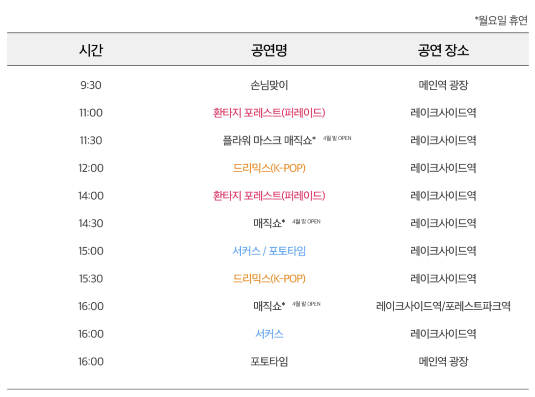 이 페스티벌의 메인공연인 ‘환타지포레스트’는 매일 11:00와 14:00 2회 공연하며, K-POP 퍼포먼스 ‘드리믹스’는 12:00와 15:30 매일 2회 공연한다. 이외에도 순간 사라지는 깜짝 매직쇼를 4월 말부터 공연 예정이고, 동구권 아티스트 디마와 안드레이의 서커스 쇼도 진행한다.