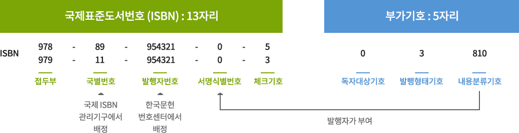 대한민국에서는 누구나 출생등록을 하면 주민등록번호를 부여받습니다. 책에도 같은 기능을 하는 ISBN이라는 번호가 있습니다. 보통 책 뒷면에 보면 바코드가 있습니다. 바코드를 스캐너로 스캔하면 13자리 숫자를 알려주지만, 일부 오래된 출판물은 10자리 숫자의 ISBN을 참조하십시오