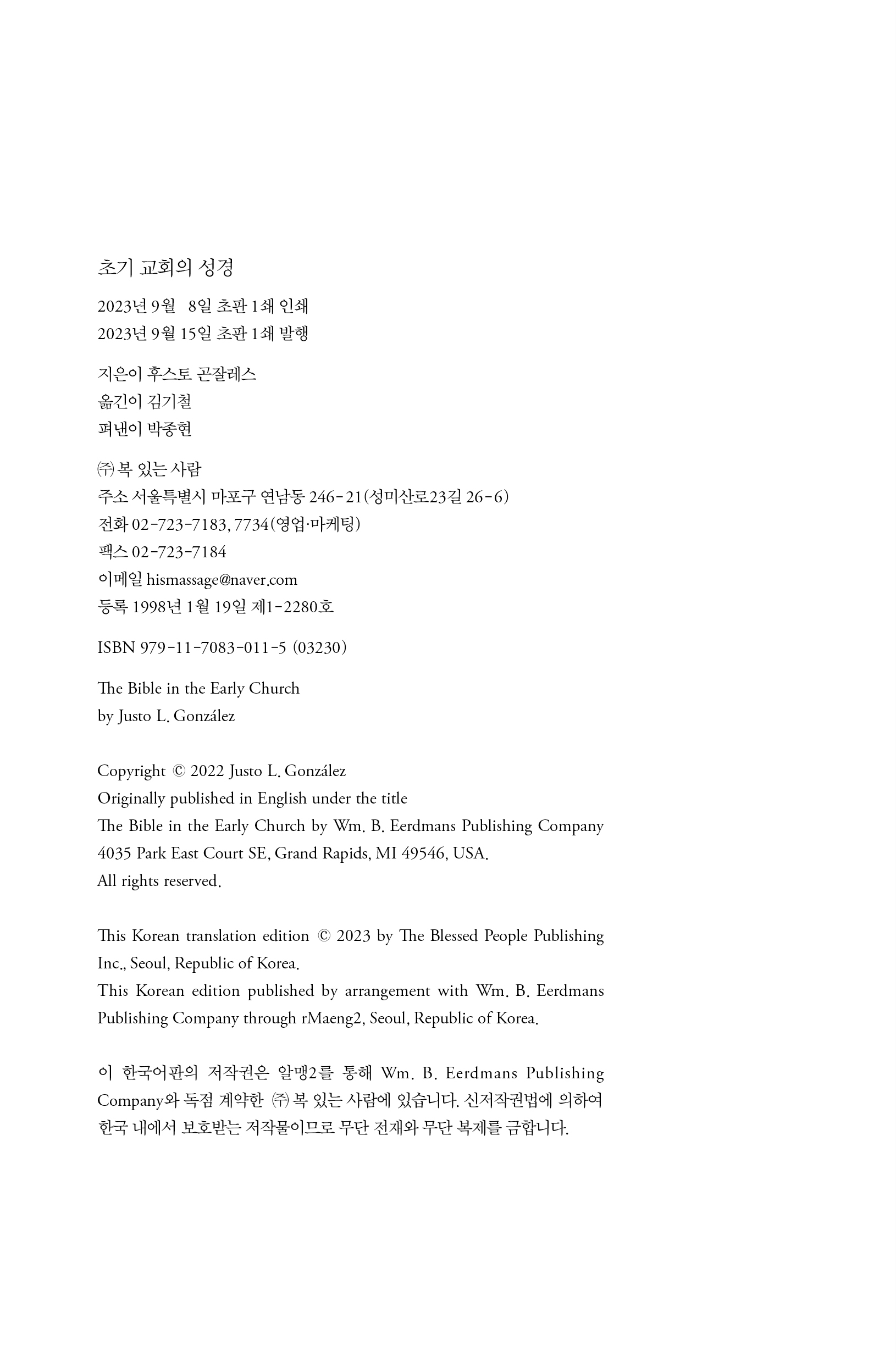 제목: 초기 교회의 성경 원제: The Bible in the Early Church 지은이: 후스토 L. 곤잘레스 옮긴이: 김기철 판형: 신국변형 (138*210), 224쪽 가격: 14,000원 ISBN: 979-11-7083-011-5 03230 분류, 주제어: 후스토 곤잘레스, 기독교 역사, 성경