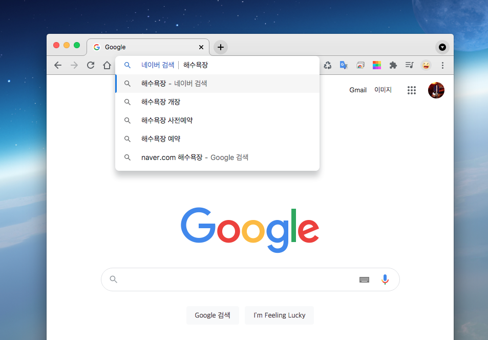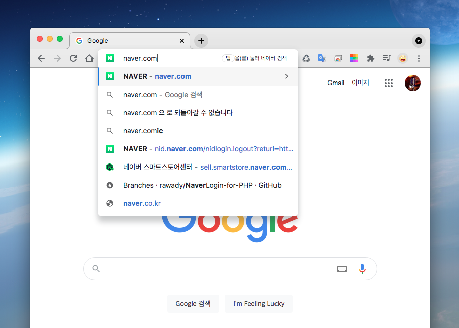하지만 크롬에서는 네이버에 접속하지 않아도 네이버에 검색할 수 있다.